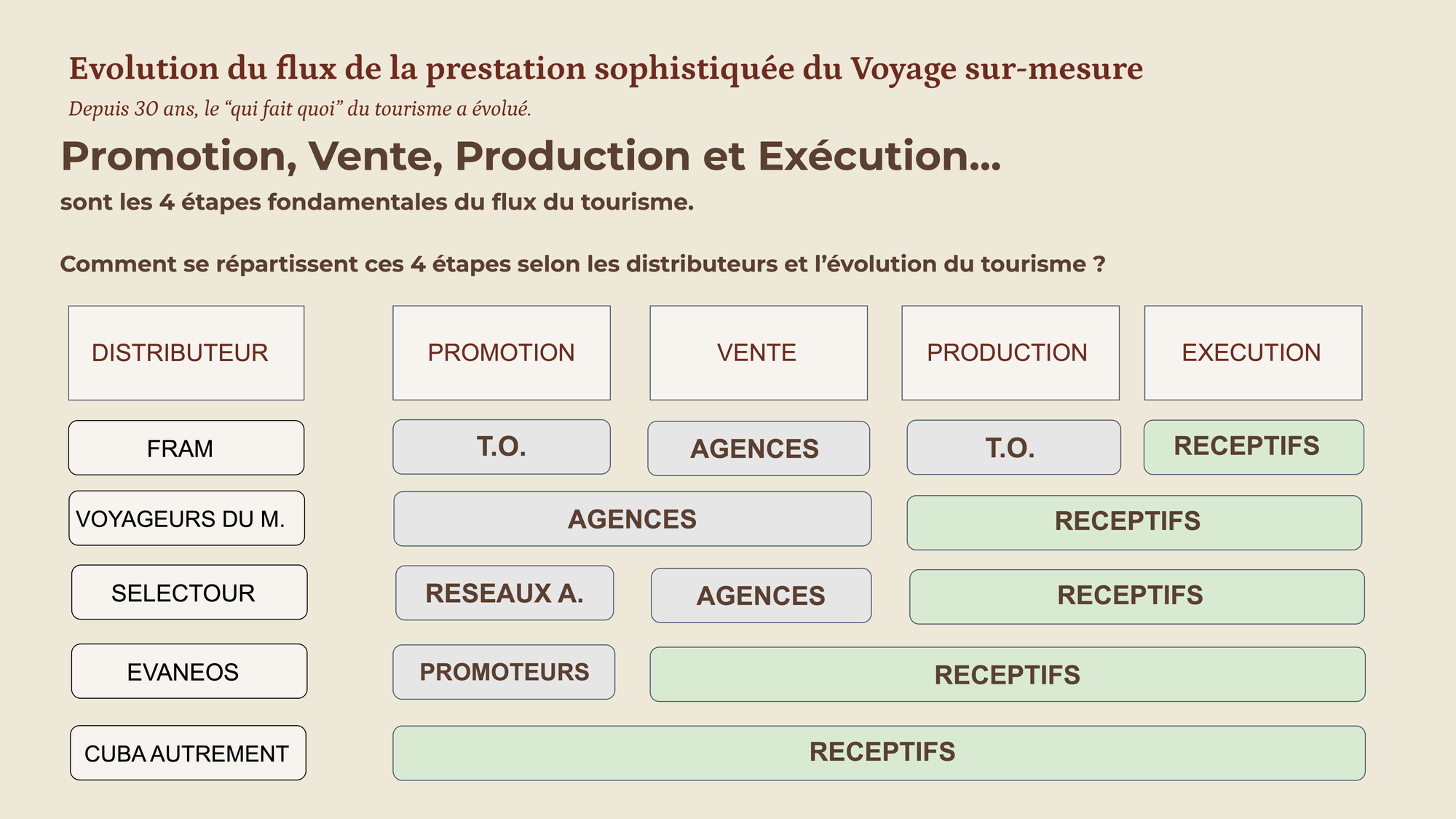 Dans le modèle du couple agence & TO, la pertinence du produit n’est pas très bonne. Elle est de moins en moins en phase avec la demande client : manque de flexibilité et forme basique des prestations. Tout comme Evaneos, l’agence & TO jouent sur le choix mais le résultat est bien plus efficace. En effet, les produits TO sont avant tout les destinations elles-mêmes, les hôtels, les voitures de location, ce qui permet un discours de promotion tranché et facile à comprendre pour le prospect. Les produits sont finis, ils ne nécessitent pas l’intervention d’un fournisseur (le réceptif). La production est maîtrisée, même si le TO et l’agence sont deux entités propres ; le flux entre elles est bien établi et cohérent. Cette production basique ne crée pas d’indépendance vis à vis du réceptif. La diffusion quant à elle est efficace, elle correspond à un marché propre, celui de proximité.